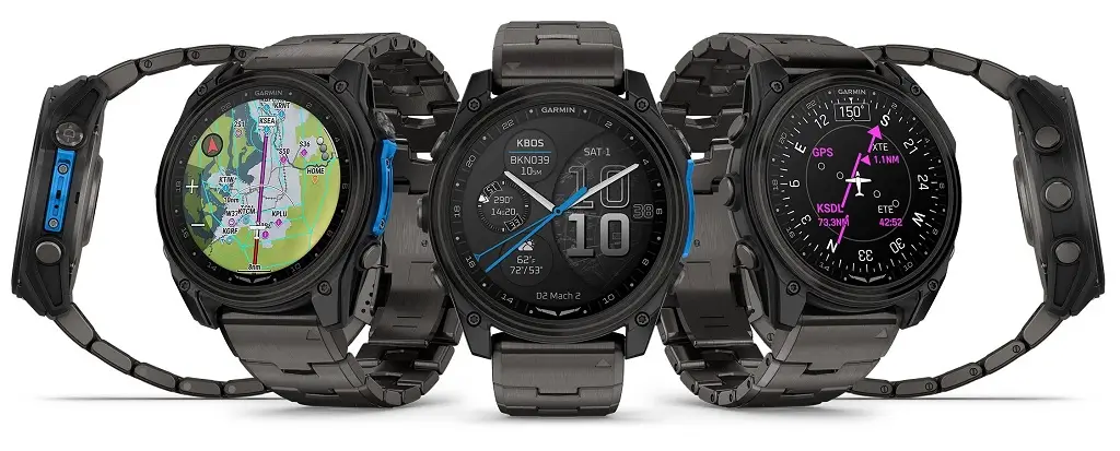 Stepping into the premium tier, the new D2 Mach 2 is engineered as an aviation equivalent to the top-tier Fenix 8-class watch, launching approximately one year after the Fenix 8’s debut. It maintains the rugged, high-end construction and advanced internals of the Fenix platform, featuring an AMOLED display protected by sapphire glass, robust leakproof buttons, resilient titanium bezels, and pre-installed maps, now integrated with its specialized aviation features.