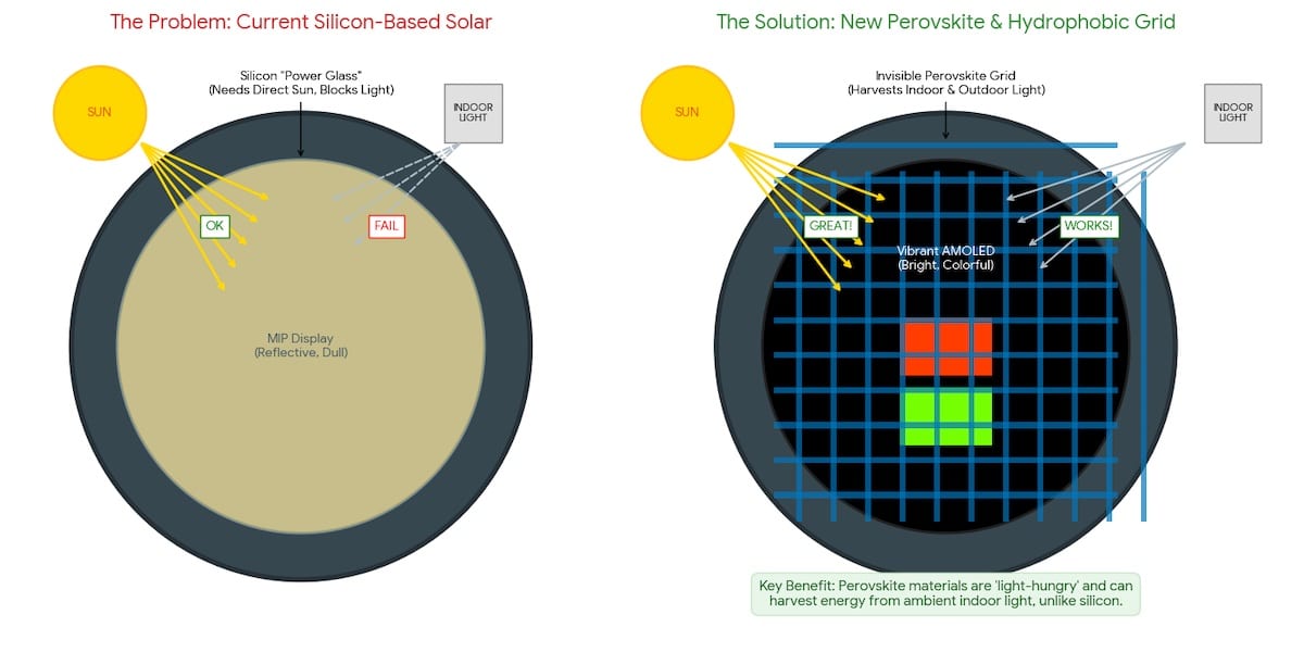 The Achilles’ heel of Garmin’s existing solar-charged wearables (such as the Fenix line) is their reliance on silicon photovoltaics. While highly effective in converting powerful sunlight (often 50,000 lux or higher), silicon cells are ineffective when light is diffuse or weak. Indoor environments, illuminated by fluorescent or LED bulbs, typically register below 500 lux. The patent highlights that perovskite and organic cells possess a critical advantage: they are tuned to absorb a broader range of the visible light spectrum and maintain high efficiency even at these much lower light levels. This material choice directly tackles the limitations of the current technology.